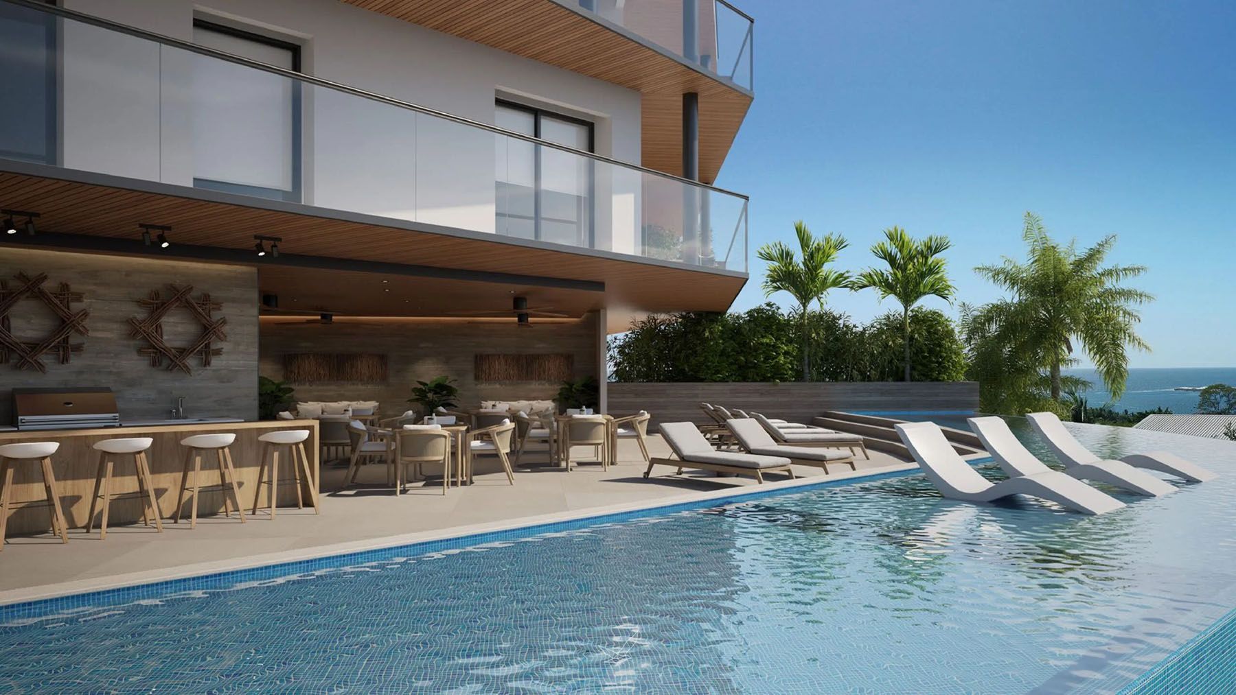 Exceptional corner residence offering breathtaking ocean and sunset panoramas! Embrace modern, open-concept living with 3 bedrooms, 3.5 bathrooms, and an expansive wrap-around terrace. Featuring 156m2 of interior A/C space complemented by 71m2 of covered terraces, this unit includes 2 parking spaces with an additional warehouse.
